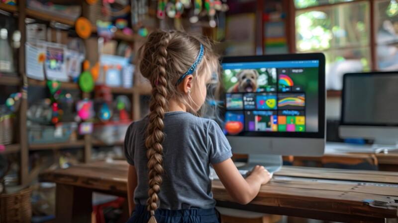A Female student working on computer with back to camera in elementary school computer classroom Free Video