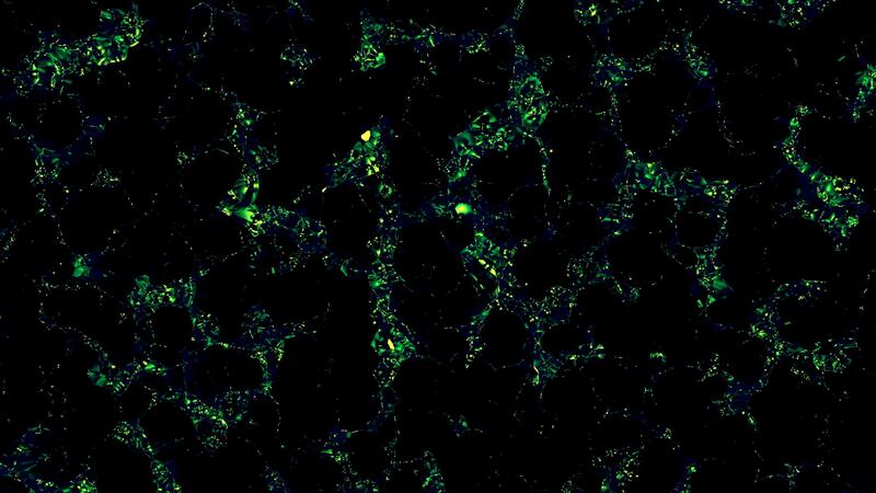 Green movement of small particles motion background. Design. Shining green stains on a black background, seamless loop. Pro Video