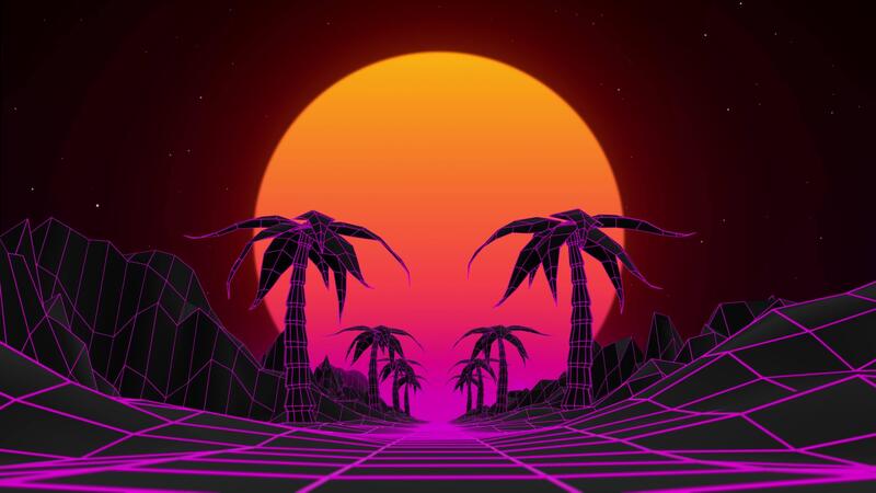 Seamless loop animation of synthwave landscape with pink neon lights, glowing wireframe net, palm trees and shiny red sunset. Retro wave background in futuristic style of the 80s and 90s. 4k , 60 fps Pro Video