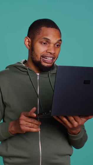 Vertical Joyful man having entertaining conversation with friends during teleconference meeting using laptop, studio background. Happy person having fun interacting with mates during online videocall, camera B Pro Video