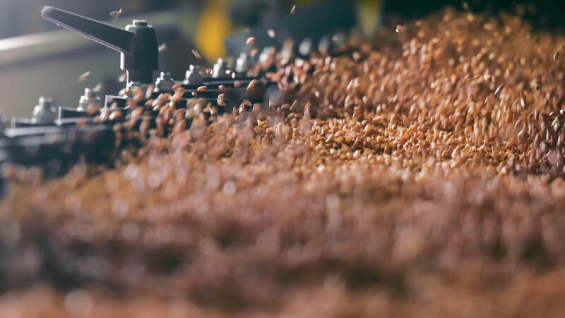 A close-up image of wheat grains being processed through agricultural machinery. The grains are in motion, highlighting the dynamic process of sorting and handling. Pro Video