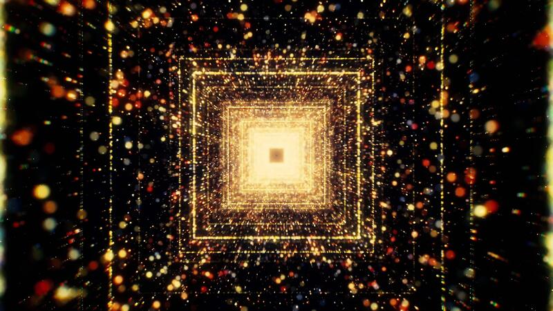 Yellow background. Motion. Various flying shiny particles in abstraction and huge squares that move forward along the background like an endless path. Pro Video