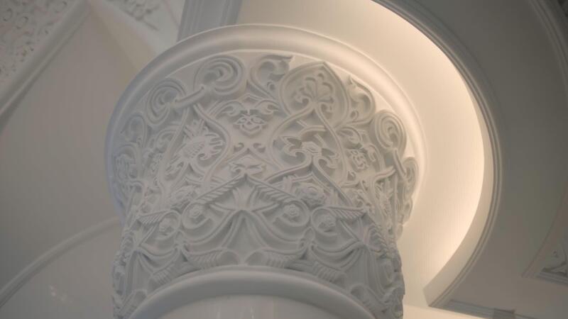 Inside the palace.Scene.A bright white stone column that is located on a white background of the palace and a high ceiling is also visible from white stone.