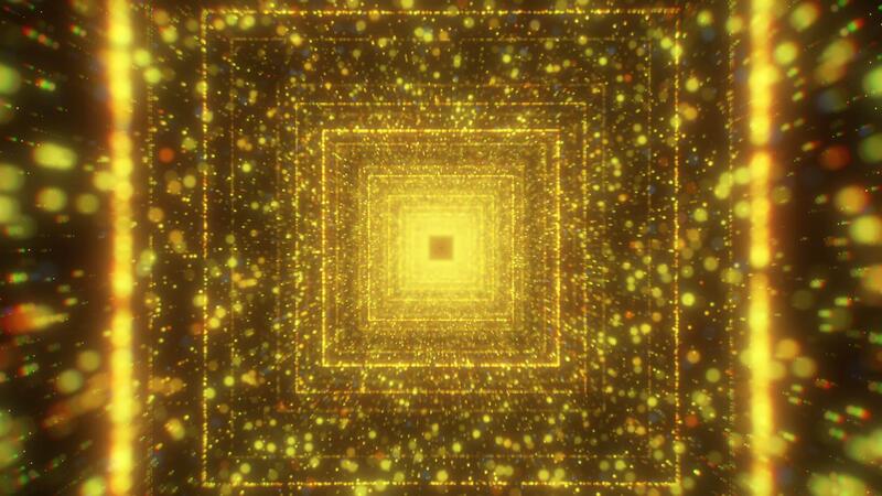 Yellow background. Motion. Various flying shiny particles in abstraction and huge squares that move forward along the background like an endless path. Free Video
