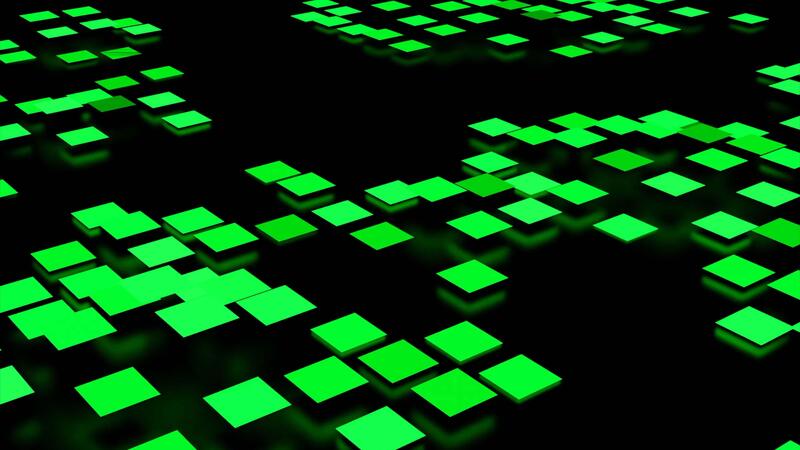 Dark background.Design.Green bright squares of small size that move and jump in abstraction. Free Video