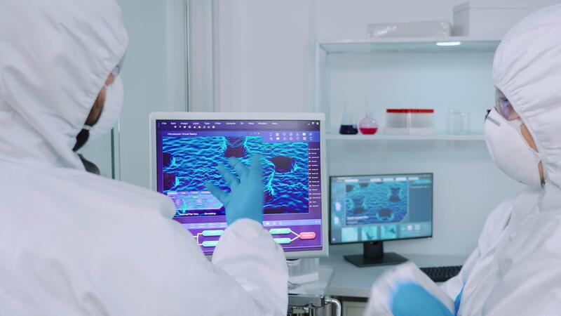 Scientists coworkers in coverall discussing about virus evolution in equipped laboratory pointing on computer desktop. Doctors examining vaccine evolution using high tech researching diagnosis Pro Video