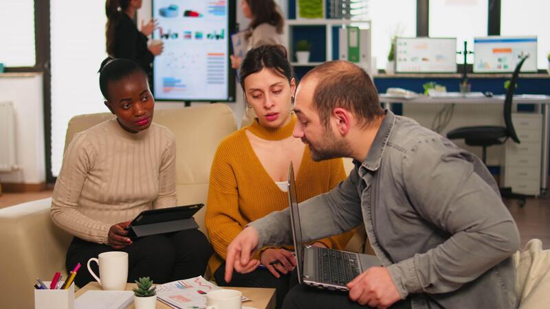 Confident company manager giving working tasks to diverse teammates sitting on couch in start up office. Multiethnic team discussing project ideas at brainstorming meeting using digital devices Pro Video