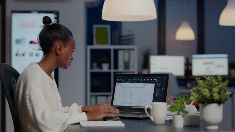African architect analysing digital plans from laptop working in start-up business office overtime. Designer using cad software to design a 3D concept of buildings creating late at night Pro Video
