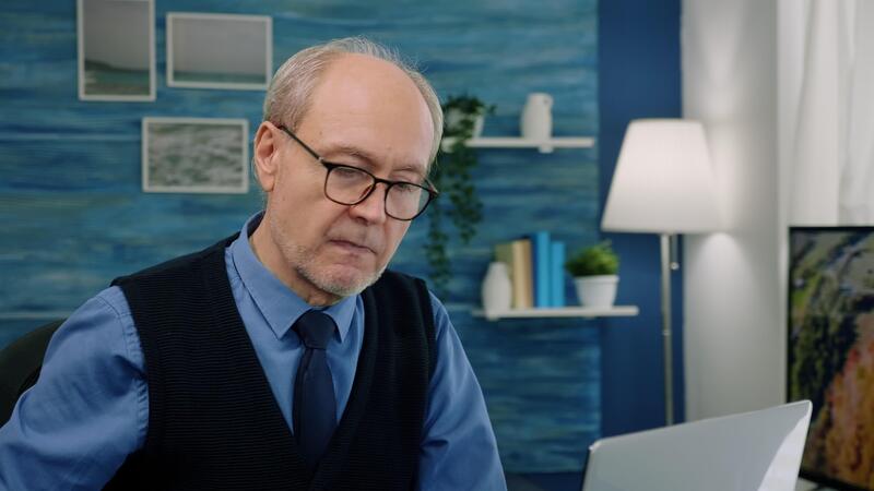Close up of senior man writing at laptop working from home analysing financial project. Elegant retired employee with eyeglasses using modern technology reading typing on computer Pro Video