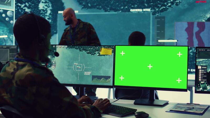 Control room operator tracking all ships anchoring along the coast line, uses isolated chromakey display in command post. Military personnel helps with real time information, reconnaissance. Camera B. Pro Video