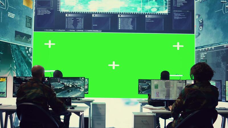 Diverse group of privates operating on a big screen isolated display, looks at a greenscreen and gathering intelligence to help with military operations in command center. Army facility base. Camera B. Pro Video