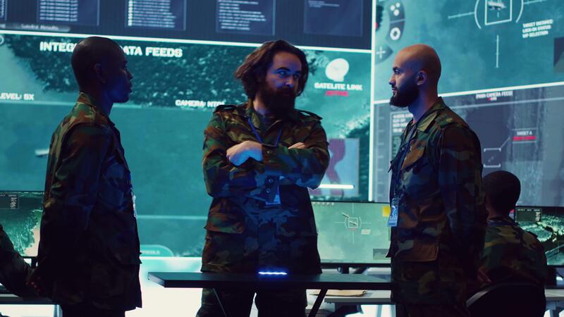 Army superior officers creating an attack plan using a hologram to gather real time information, working together to ensure national safety in a command center. Military operations. Camera A. Pro Video