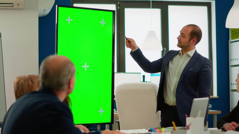 Young man leader of company presenting financial strategy using green screen mockup display in front of diverse team brainstorming. Manager explainig project showing monitor with chroma key desktop Pro Video