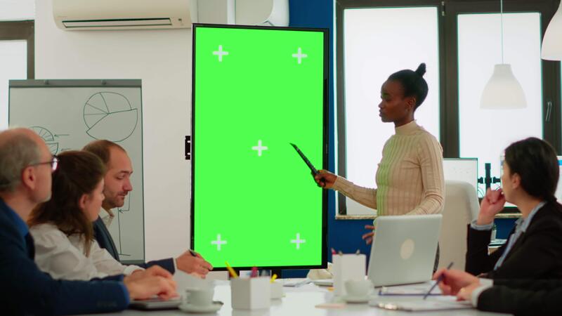 Diverse woman standing in start up office discussing strategy with green screen monitor in front of business partners. Manager explaining to multiethnic team project chroma key display mock up desktop Pro Video