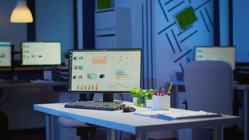 Empty start up business office with modern design during night with graphics running on the desktop. Financial company with nobody in it, place of work startup, workplace indoors concept Pro Video