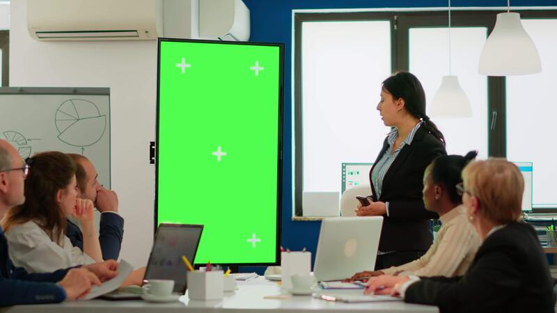 Leader of company presenting financial plan using mockup display in front of diverse team brainstorming. Manager explainig project strategy on green screen monitor with chroma key desktop in boardroom Pro Video