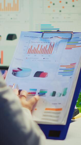 Vertical . Close up of business woman holding clipboard with graphics and financial statistics working overtime in front of computer sitting in start-up business office. Busy employee using modern technology Pro Video