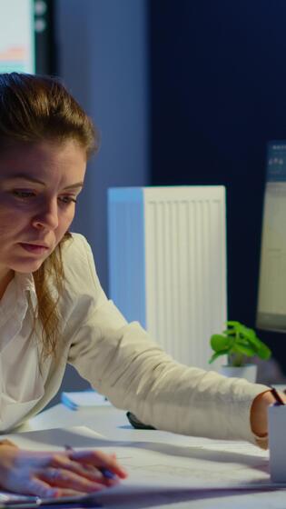 Vertical . Overworked woman architect analysing and matching blueprints sitting at desk in front of computer late at night. Designer using arhitecture plans of buildings working overtime, creating and studying Pro Video