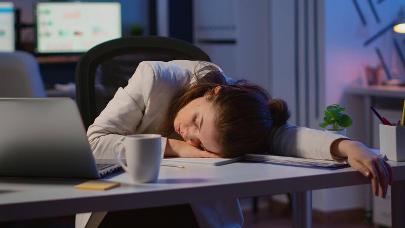 Exhausted overload business woman falling asleep on desk with open laptop monitor while working in start up company office. Employee using modern technology network wireless doing overtime sleeping Pro Video