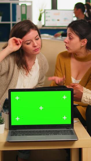 International business team talking to african woman discussing company plan with mockup laptop in front of camera. Leader explainig project strategy using green screen pc with chroma key display. Pro Video