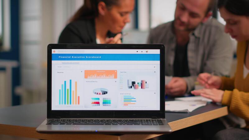 Laptop screen ready for financial project presentation placed on desk while business people work in background. Diverse employees gathered in co-working, working process in busy company, teamwork help Pro Video