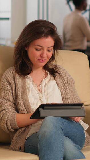 Manager woman searching on tablet sitting in relax zone on confortable couch smiling, pointing on notepad smiling while diverse colleagues working in background. Coworkers planning financial project Pro Video