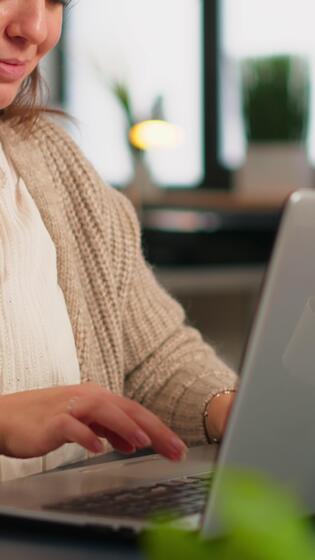 Close up of authentic happy professional employee sending mails sitting at desk in front of lapotop smiling, working financial startup company. Diverse team analyzes statistics data in modern office Pro Video