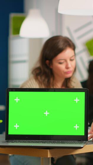 Group of business people discussing company plan with mockup laptop in front of camera, pc ready for financial project presentation placed on desk. Leader using green screen pc with chroma key display Pro Video