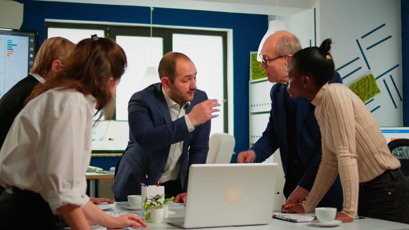 Diverse businesspeople working in teamwork discussing project strategy using laptop standing at conference table. Manager executive analysing financial data during business meeting in broadroom Pro Video