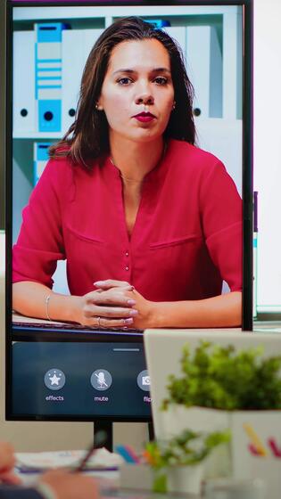 Diverse team of coworkers talking with project manager using web cam during business conference sitting in broadroom. Employees interacting with manager on virtual meeteing, online briefing. Pro Video