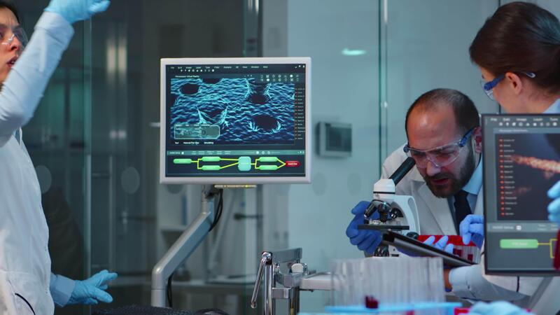 Team of scientists doing biological researches under microscope, lab technician writing data in computer in modern equipped laboratory Group of doctors examining virus evolution using high tech. Pro Video