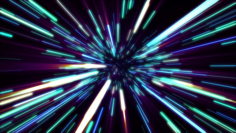 Loop background with flying through the hyperspace. Lightspeed universe tunnel made of glowing neon lines with different colors and soft light effect. Animation of travelling in space. 4k, 60 fps Pro Video