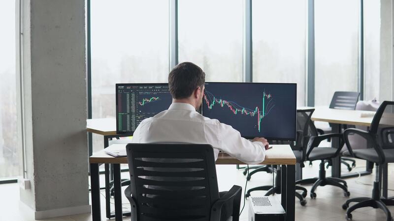Back view of trader is working with multiple computer screens full of charts and data analysis and stock broker trading online. Concept of bitcoin and stock market trading Pro Video