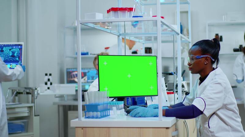 African scientist woman typing on computer with green mockup in modern equipped lab. Multiethnic team of microbiologists doing vaccine research writing on device with chroma key, isolated display. Pro Video
