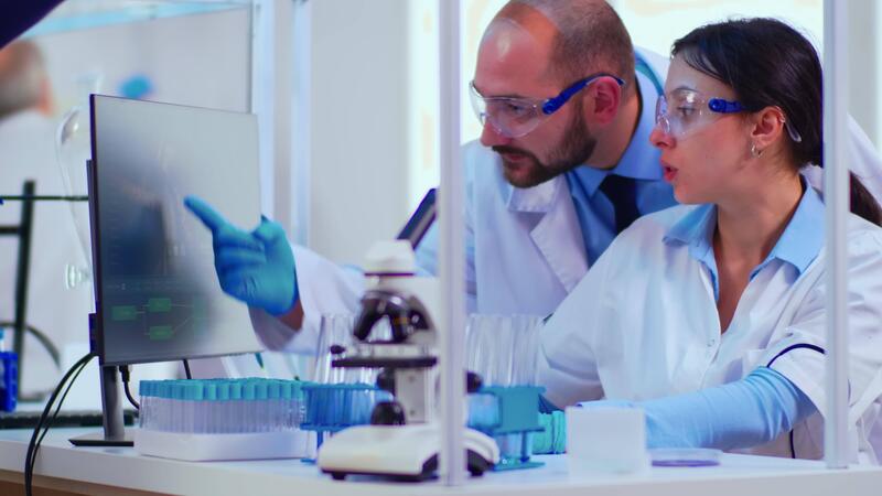 Chemist nurse explainig to doctor vaccine development in modern equipped laboratory pointing on computer desktop. Team of doctors examining virus evolution using high tech researching diagnosis Pro Video