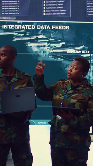 Vertical Sergeant major and female soldier checking real time field data in command post monitoring room, examining missions and operations. Team of troops interprets satellite imagery. Camera B. Pro Video