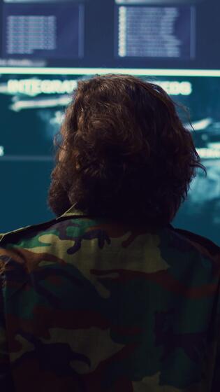 Vertical Sergeant major of the army handling a secret service operation by gathering intelligence from field troops and satellite CCTV imagery. Conducting a reconnaissance mission in command post. Camera B. Pro Video