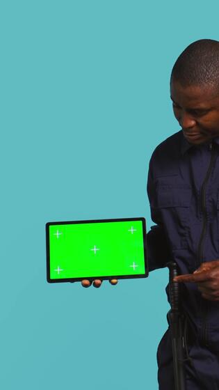 Vertical Portrait of happy security staff member showing isolated screen tablet. Joyous patrolling agent maintains secure environment, showcasing chroma key device, studio background, camera B Pro Video