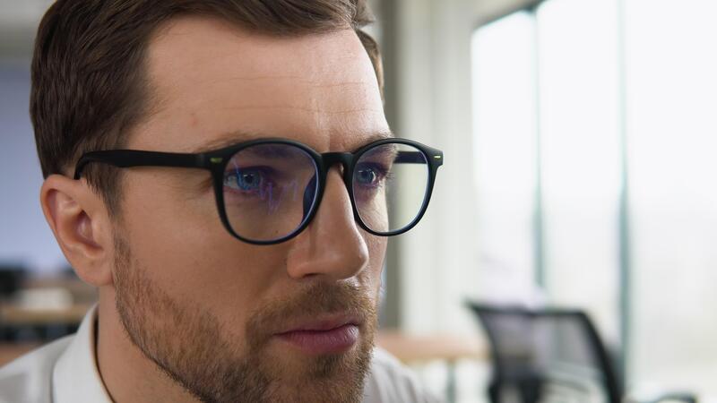 Crypto trader wearing eyeglasses working looking at computer screen reflecting in glasses analyzing online trading stock exchange market financial data charts. Close up eye in spectacles reflection Pro Video