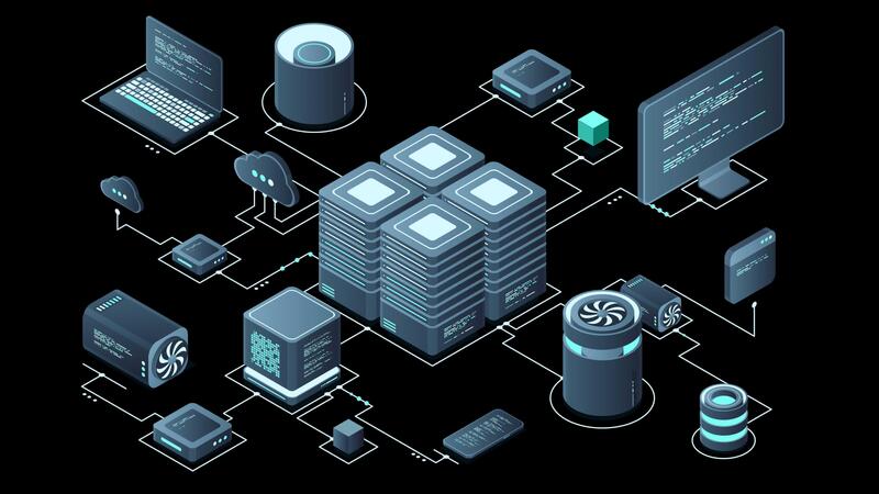 Isometric computer technology animation. Computation of big data center. Cloud computing. Online devices upload and download information. Transparent background with alpha channel Free Video