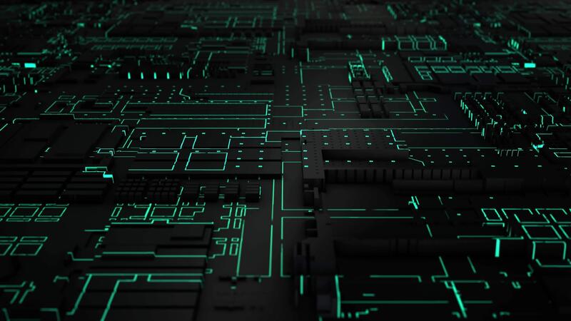 Abstract 3D background with computer board and glowing green circuits with moving electric impulse signals. Abstract animation for modern information technologies and artificial intelligence. 4K 60fps Pro Video