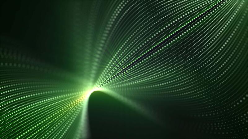 Looped green background with digital patterns of dotted lines in a shape of elegant futuristic structure with soft glow effect. Data stream, binary code and sound wave visualization. VJ loop, 4k 60fps Pro Video