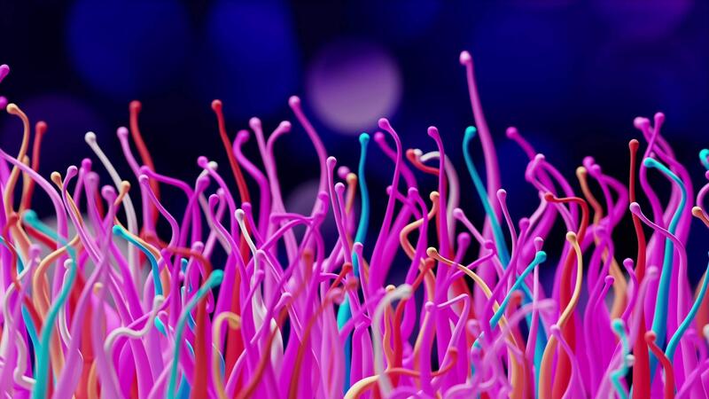 Abstract background of glowing multicolor spline life forms on dark background. 3D Animation Pro Video
