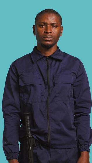 Vertical Portrait of smiling security agent securing assigned post, isolated against studio background. African american guardian prepared to handle security breaches and diffuse tense situations, camera B Pro Video
