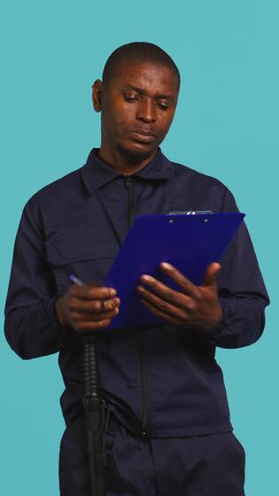 Vertical Security guard holding clipboard, taking notes, receiving orders during protection job shift. Portrait of bodyguard using pen to write informations received, studio background, camera B Pro Video