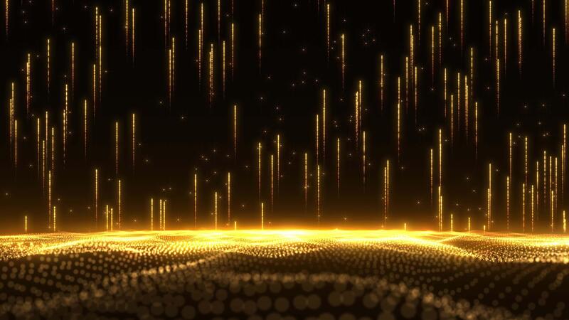 Abstract digital dynamic waves of golden particles with light motion lights background, data flow, cyber technology. 3D rendering. Loop 4K for awards and celebrations. Screensaver animation Pro Video