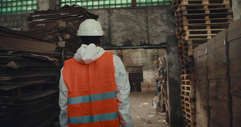 From behind, a brunette man in a white uniform and an orange vest in a White protective helmet walks along the racks with waste paper and goes out into the huge Hall of the waste recycling and sorting Pro Video