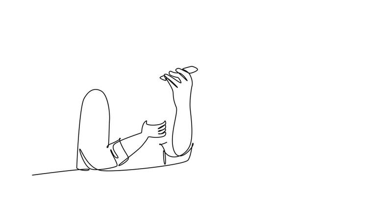 Self drawing animation of single line draw male director sitting on work chair, drinking coffee and calling his managers in front of computer. Business talk. Continuous line draw. Full length animated Pro Video