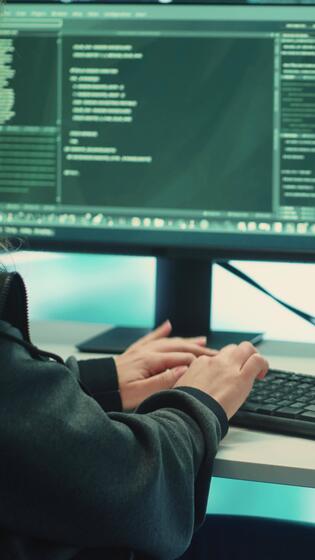 Vertical Cyber intelligence team using advanced technology to secure computer networks, governmental espionage system. Emphasizing cyber security and threat detection to combat cyberterrorism. Camera A. Pro Video