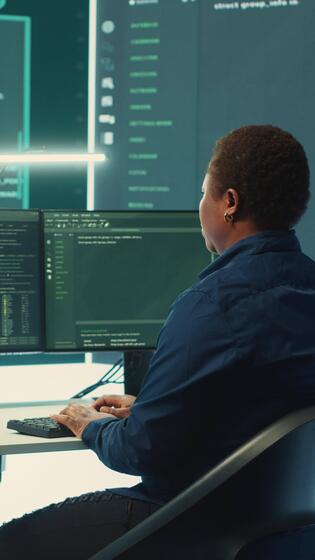 Vertical Governmental hackers using advanced software to protect against cyber threats, working in team. Specialists on cyber security, data and network protection unite forces in high tech office. Camera A. Pro Video